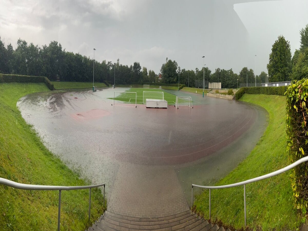 Am nächsten Morgen war das Regenwasser auf der Sportanlage schon wieder versickert und es konnte aufgeräumt werden.