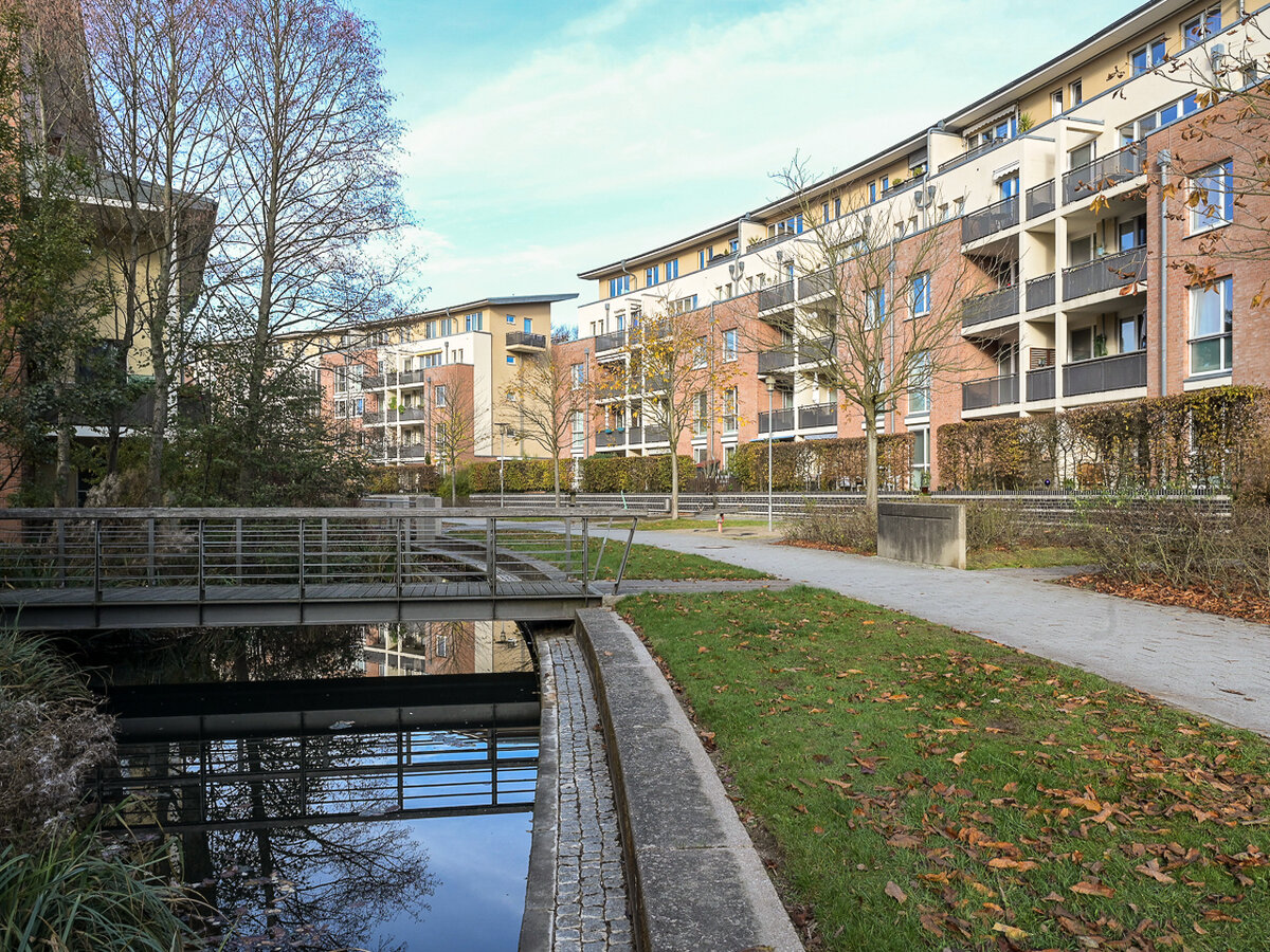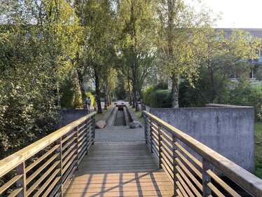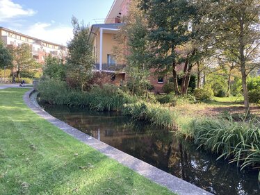 In besonderer Weise folgten die Projektbeteiligten hier dem Schwammstadt-Prinzip der Mehrfachnutzung: Die Grünfläche im Inneren der ehemaligen Rennstrecke ist nicht nur ein öffentlicher Park, sondern eine Regenwasserbewirtschaftungsanlage. Der Weg dahin war herausfordernd, denn anstelle naheliegender, aber aufgrund der Bodenbeschaffenheit nicht realisierbarer Versickerungsanlagen wird ein offenes Oberflächenentwässerungssystem geschaffen. Es beinhaltet ein nach ökologischen Kriterien gestalteten Mulden- und Grabensystem, dessen Hauptgräben als Retentionsräume fungieren, indem sie Regenwasser sammeln, zurückhalten und reguliert ableiten. Lernen Sie das ausgeklügelte System kennen, das den Wasserabfluss in diesem außergewöhnlichen und mit internationalem Städtebaupreis ausgezeichneten Hamburger Quartier reguliert und dosiert.