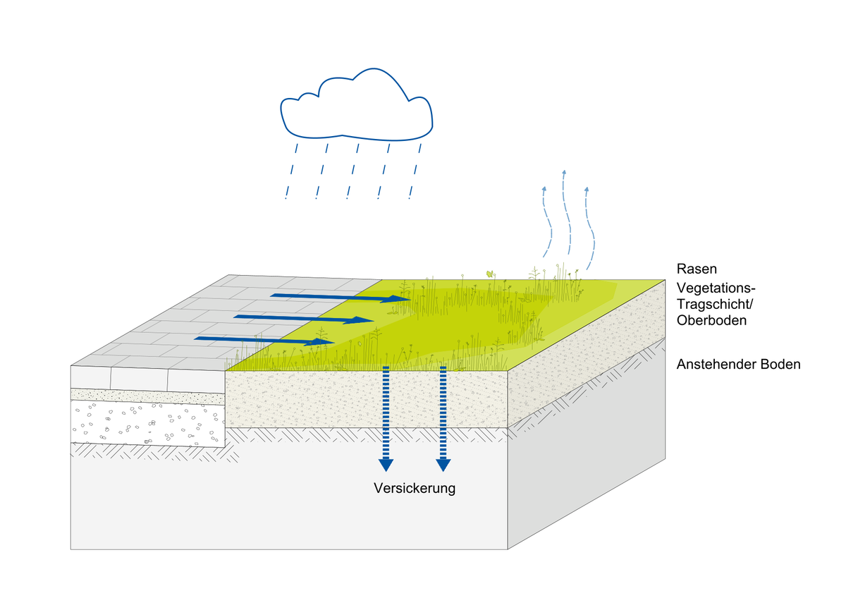 Das Regenwasser ist für Flora und Fauna verfügbar. Die Verdunstung des im Oberboden gespeicherten Regenwassers hat dabei einen kühlenden Effekt auf die Umgebungstemperatur.