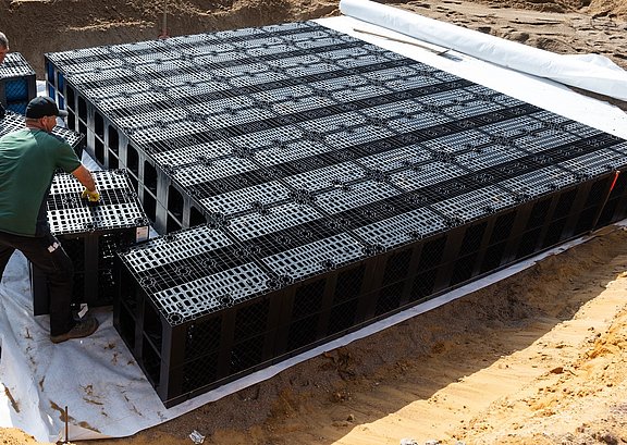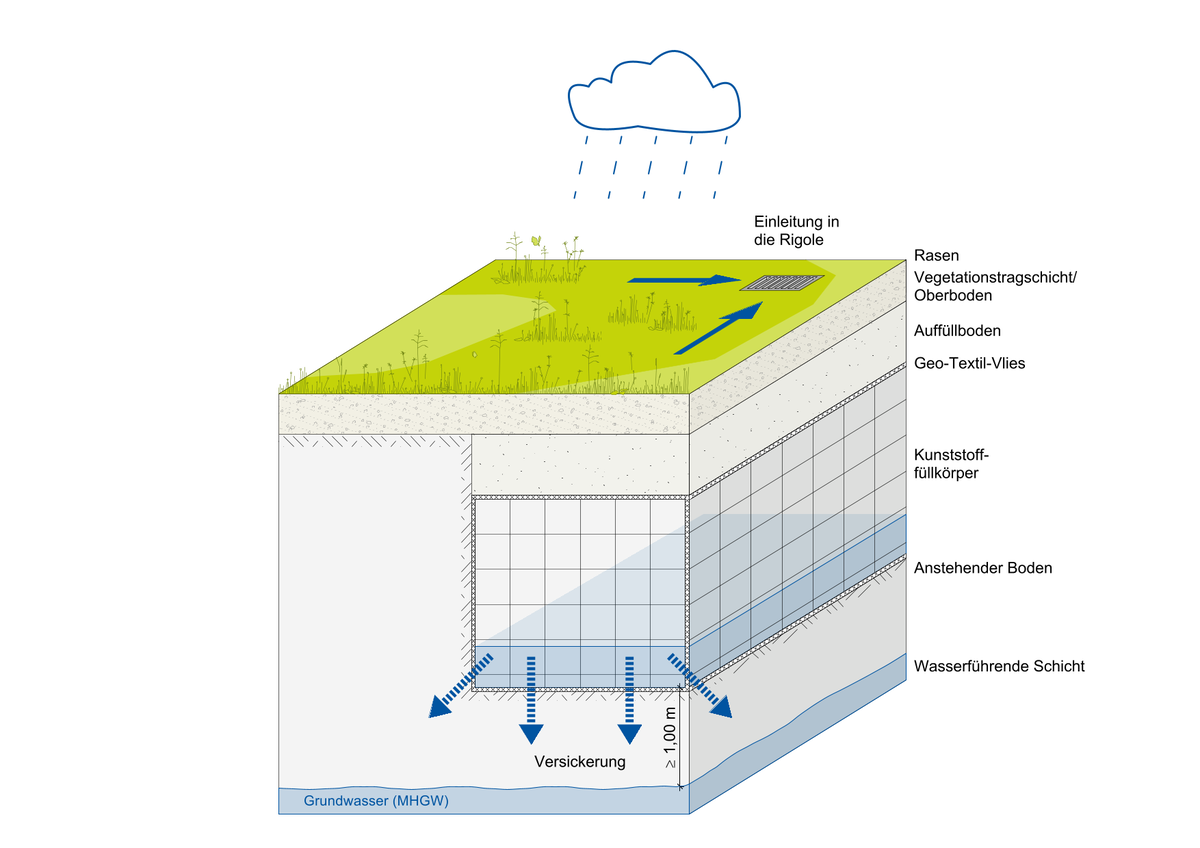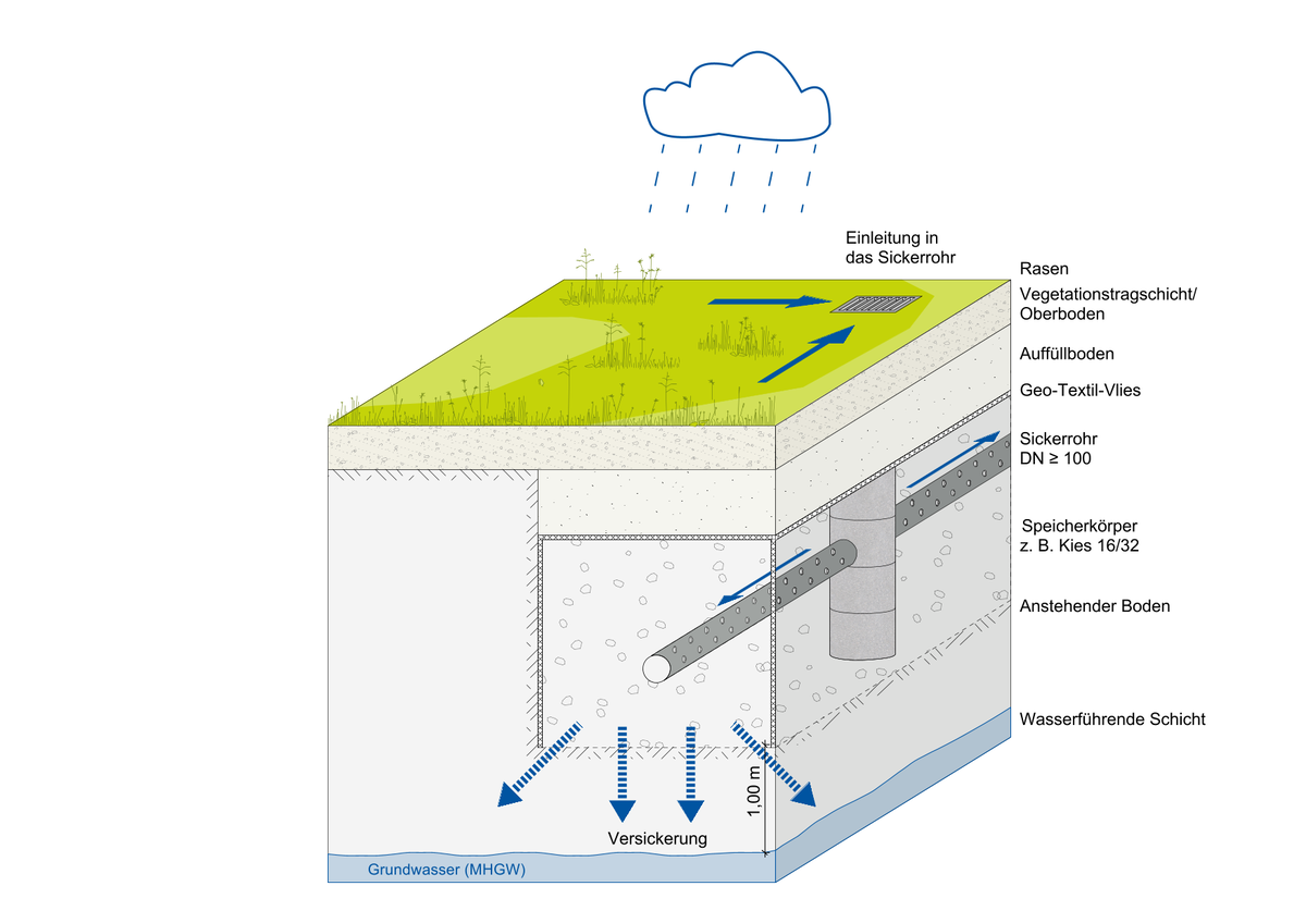 Wenn an der Oberfläche keine Möglichkeit der Rückhaltung von Regenwasser besteht, kann die Zwischenspeicherung in unterirdischen Rigolen eine Lösung sein.