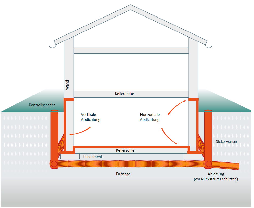 Verschiedene Maßnahmen verhindern, dass Sickerwasser und Bodenfeuchtigkeit in das Gebäude eintreten. Bei der Planung eines Neubaus sollten die erforderlichen Maßnahmen von Anfang an berücksichtigt werden und grundlegende Kenntnisse, wie die langfristige Entwicklung des Grundwasserstands, eingeholt werden. Bei Bestandsgebäuden lassen sich die meisten Maßnahmen ebenfalls umsetzen, bedeuten dann aber einen erhöhten technischen und finanziellen Aufwand.