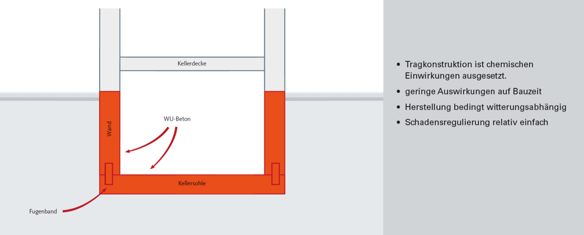 In Bereichen, in denen der höchste gemessene Grundwasserstand bis in die Höhe der Bebauung - also in den Keller oder das Fundamente - reicht, sind geeignete Abdichtungsmaßnahmen gegen drückendes Grundwasser und aufsteigende Feuchtigkeit in der Wand vorzunehmen. Um die Bauwerke, insbesondere den Keller, vor eindringender Feuchtigkeit zu schützen, werden die Außenwände mit wasserundurchlässigen Materialien verkleidet. Als Material eignen sich bahnenförmige oder flüssig zu verarbeitende Abdichtungsstoffe. Abdichtungen können auch im Bestand nachträglich aufgetragen werden. Beispielhaft zu nennen ist hier die „Schwarze Wanne“, bei der die Wände und der Boden des Kellers von außen vor Wasser geschützt werden, indem eine lückenlose Abdichtung aus Bitumenbahnen oder Bitumenanstrichen aufgebracht wird.