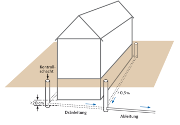 Wenn es zeitweise zu einem Aufstau von Sickerwasser kommt, kann zusätzlich zu den Abdichtungsmaßnahmen eine Dränage erforderlich sein. Die Dränage wird ringförmig um das Haus gelegt und kann durch kleine Öffnungen in der Leitung Wasser aufnehmen. So wird verhindert, dass drückendes Wasser entsteht und das Gebäude beschädigt.