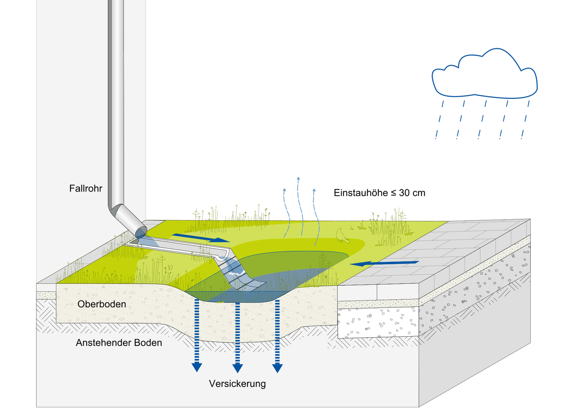 Durch die Muldenversickerung wird das Regenwasser über eine flächige Verdunstung und Versickerung in den Wasserkreislauf zurückgeführt, trägt damit zur Grundwasserneubildung bei und versorgt anteilig die nähere Vegetation.