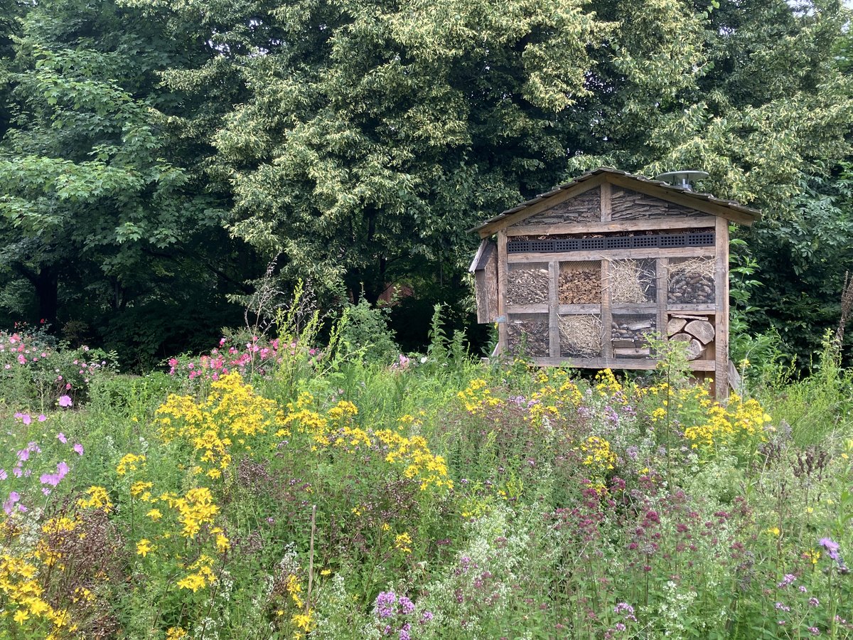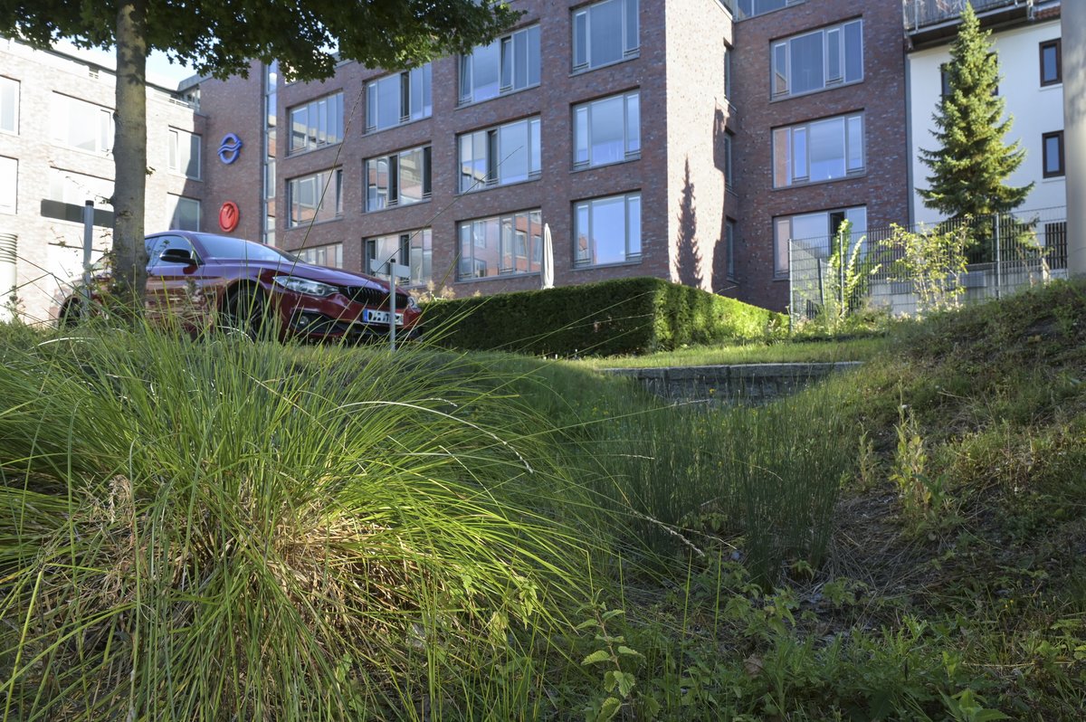 Auch die Gestaltung der Flächen spielt eine wichtige Rolle. So wurden Fahrrad- und Lagerschuppen mit Gründächern ausgestattet, die Regenwasser zurückhalten und zwischenspeichern. Die Parkplatzflächen sind so angelegt, dass das Regenwasser in begrünte Mulden zwischen den Stellplätzen abfließen und dort versickern kann. Wo es möglich war, wurden versiegelte und ungenutzte Flächen entsiegelt und begrünt – ein Gewinn für das Mikroklima und die Biodiversität auf dem Gelände.