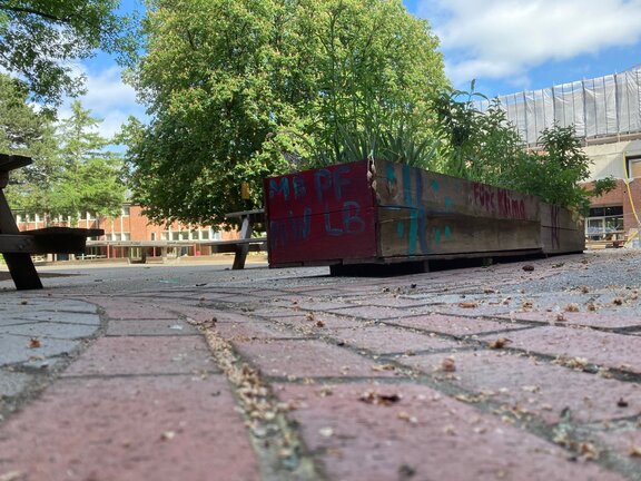 Mitten auf dem Schulhof des Gymnasium Lerchenfeld steht eine Rotbuche. Der Hof ist durch die Schüler hoch frequentiert und dennoch gelingt es, das Regenwasser der Dachflächen zurückzuhalten und dem Naturdenkmal zugutekommen zu lassen.