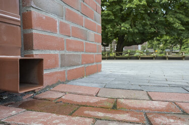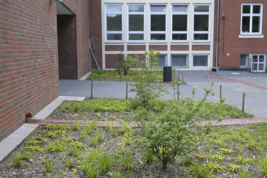 Der neu umstrukturierte Haupteingang dient nun auch als öffentlich zugängliche Wegverbindung zwischen Finkenau und Lerchenfeld, bei der das Oberflächenwasser über offene Mulden, welche geschickt in Grünstreifen integriert wurden, versickern kann. Außerdem werden die Enden der Fallrohre im Bereich des Haupteingangs in offene Rinnen geführt, wodurch die Bodenversiegelung reduziert und das Regenwasser erlebbar gemacht wird.