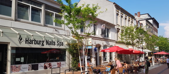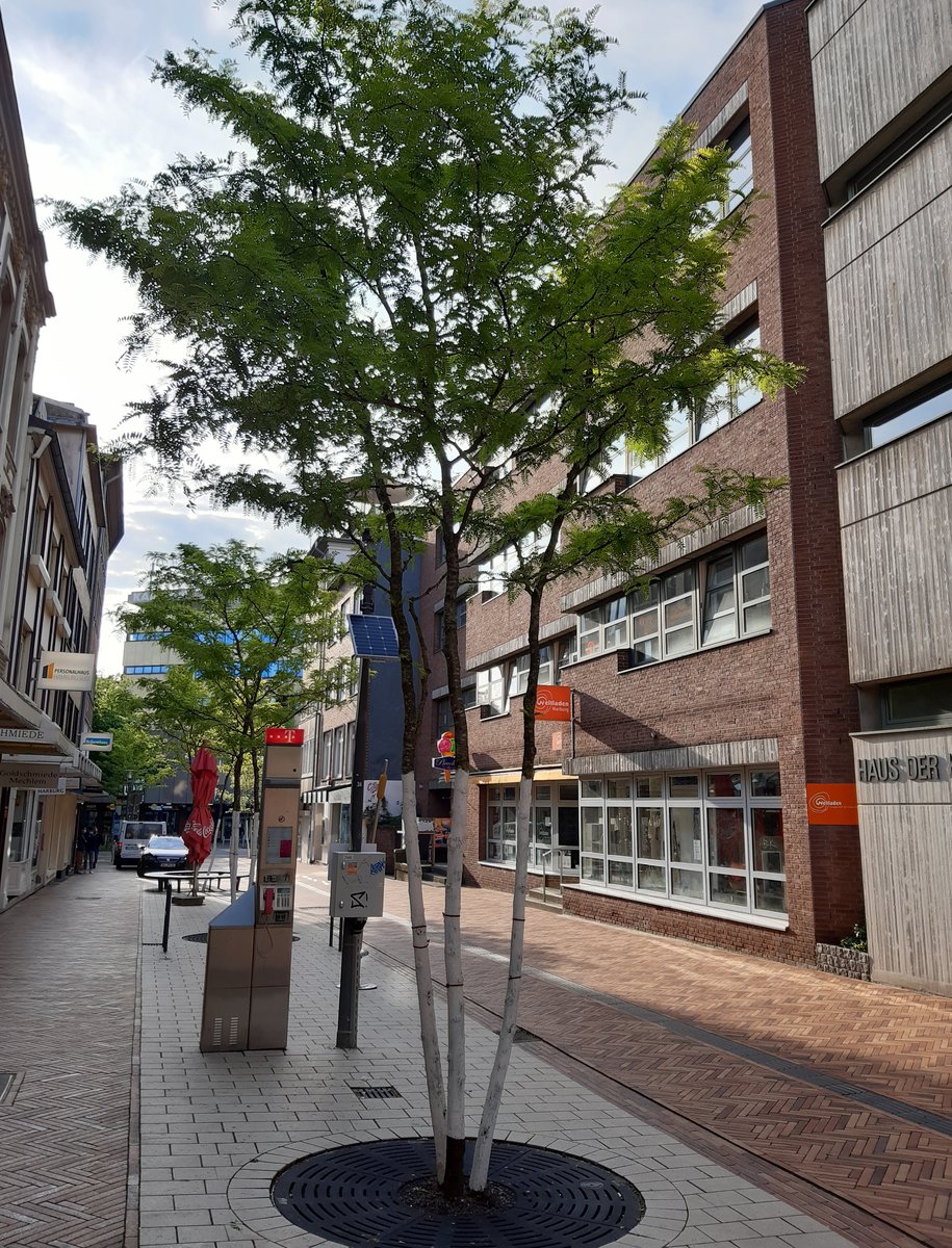 Im Zuge der Neugestaltung der Fußgängerzone wurden mehrere neue Bäume gepflanzt und mit Baumrigolen ausgestattet. Das Regenwasser von angrenzenden Dachflächen wird über einen Bewässerungsschacht unterirdisch in die Baumgruben geleitet und dort gespeichert. Das Besondere: Die Baumrigole ist nach unten hin abgedichtet, sodass sich Regenwasser dort anstauen und gespeichert werden kann. Damit die Wurzeln nicht dauerhaft durchnässt werden, kann überschüssiges Wasser seitlich in die umgebenden Bodenbereiche frei versickern.