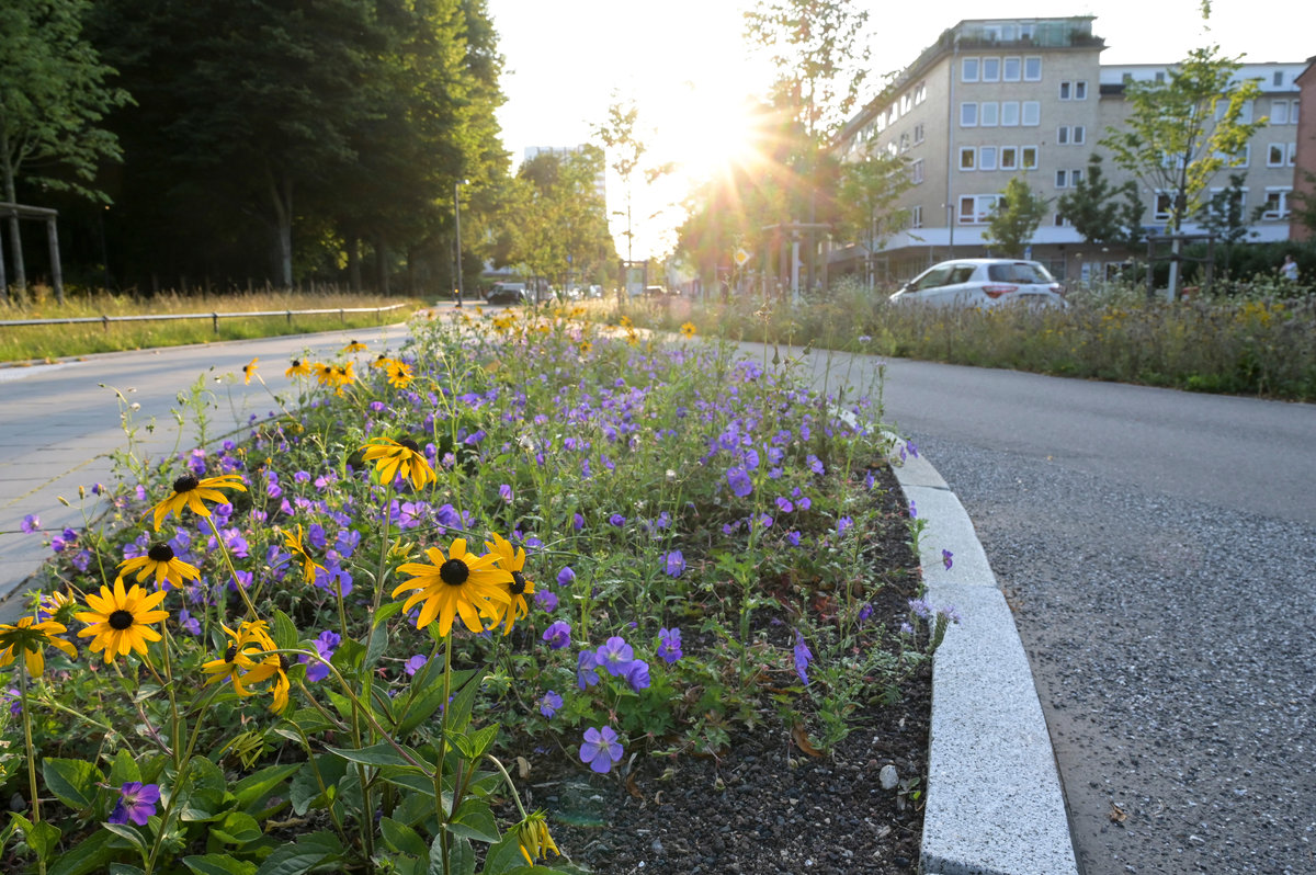 Die ohnehin sanierungsbedürftige Straße bot die ideale Gelegenheit, sie nicht nur verkehrlich neu zu denken, sondern auch als Teil der blau-grünen Infrastruktur Hamburgs weiterzuentwickeln. Wo zuvor ein Bruch im Grünzug Neu-Altona klaffte, wurde wieder eine Verbindung hergestellt. Die Straße bettet sich jetzt in das städtische Grün ein. Ihre Umgestaltung schafft nicht nur eine neue Freiraumqualität, sondern leistet auch einen aktiven Beitrag zur Verbesserung des Stadtklimas und der Biodiversität.