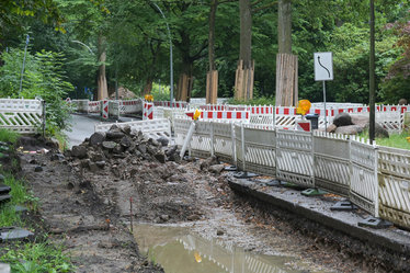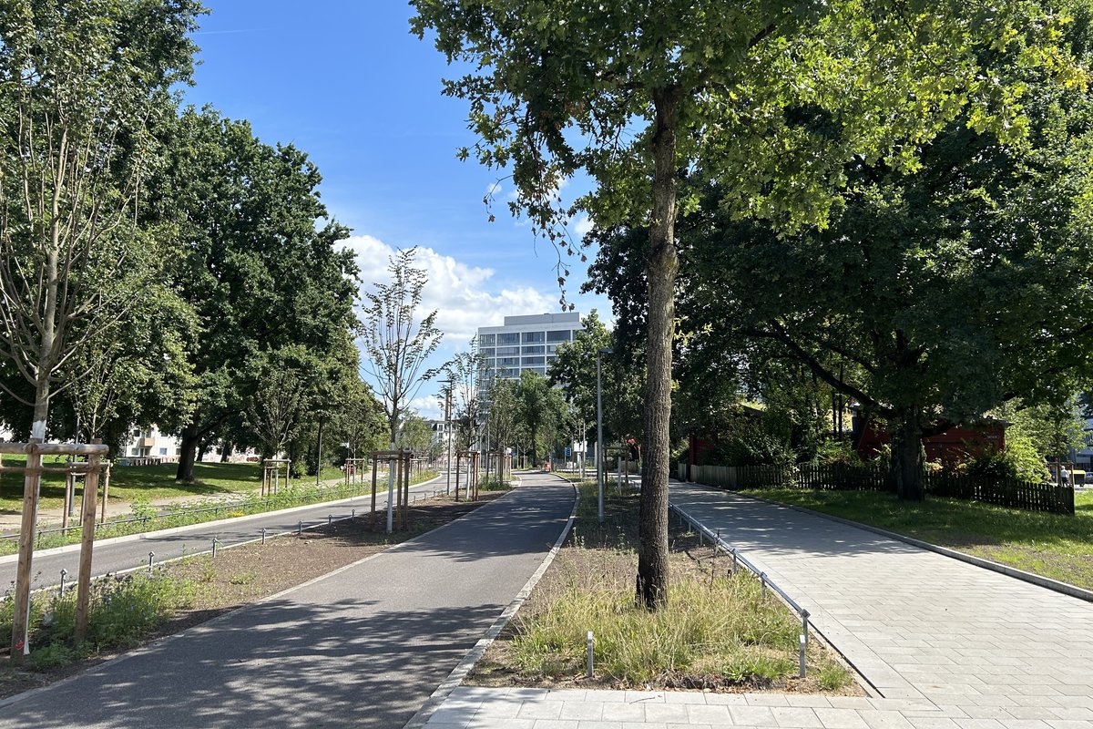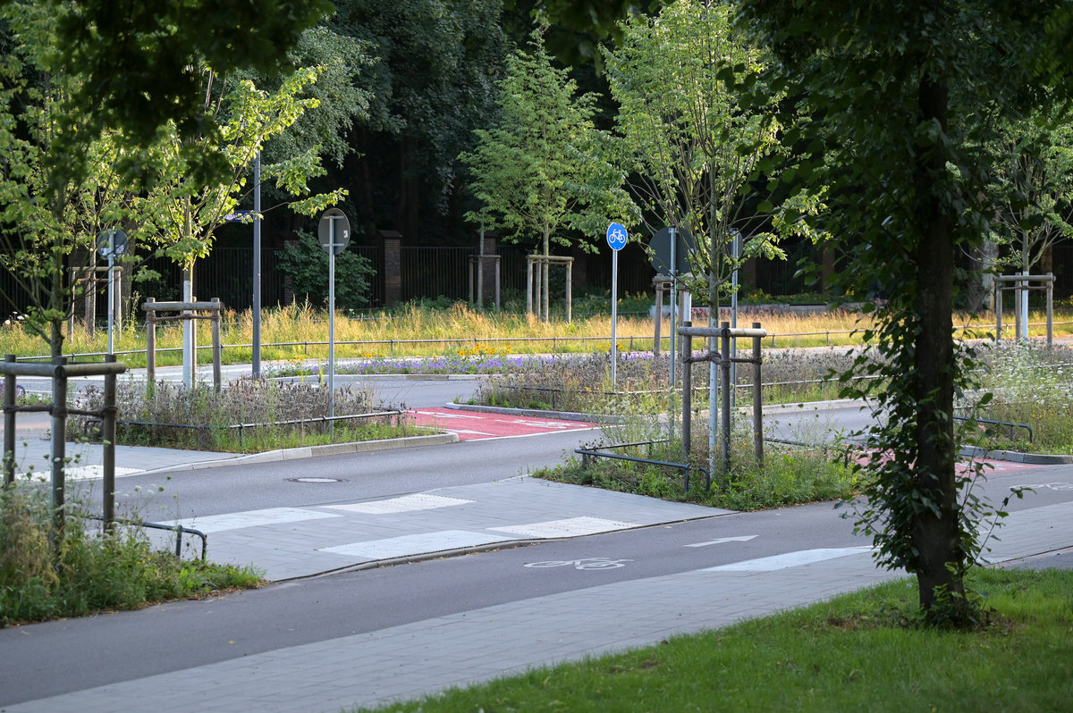 Insgesamt wurden rund 3700 Quadratmeter Fläche entsiegelt, wodurch die Einleitung von Regenwasser in die Kanalisation um etwa 8100 Quadratmeter reduziert werden konnte – das entspricht mehr als einem Fußballfeld. Die Geh- und Radwege entwässern, wo möglich, direkt in angrenzende Grünflächen. Spezielle, wasserspeichernde Substrate sorgen dafür, dass Regenwasser verzögert versickert und die Vegetation vital bleibt. So wird nicht nur das Mikroklima verbessert, sondern auch die Kanalisation entlastet – ein wichtiger Beitrag zur Vermeidung von Mischwasserüberläufen bei Starkregen.