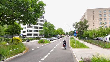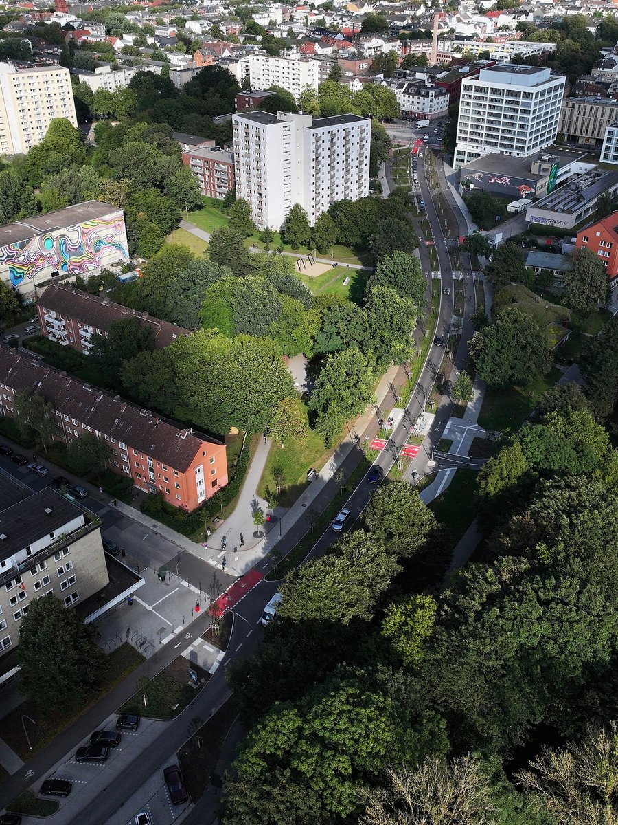 Die Luise-Schröder-Straße in Hamburg-Altona wurde in den 1950er Jahren im Sinne einer autogerechten Stadt gebaut – und etwa 75 Jahre später mit dem Deutschen Fahrradpreis ausgezeichnet! Denn statt einer dreispurigen Einbahnstraße findet man dort heute einen zweispurigen Grünstreifen, der die zwei breiten Radwege von der Autospur in der Mitte abgrenzen.