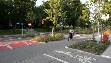 5. Hydrologisch optimierte Baumstandorte: Die Standorte der 56 neu gepflanzten Bäume wurden so angelegt, dass das Regenwasser von der Straße oberflächlich in die Baumgruben fließen kann. Das erhöht die Wasserversorgung der Bäume. Durch Verschattung und Verdunstung leisten sie außerdem einen aktiven Beitrag zur Minderung des Wärmeinseleffekts.